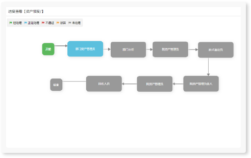 固定资产管理系统中引进了工作流技术,从而有效地将工作流从系统中分离出来,进而作为一个核心模块完成流程调度、处理等工作。工作流流程信息通过数据库管理系统与其他的模块实现信息共享。